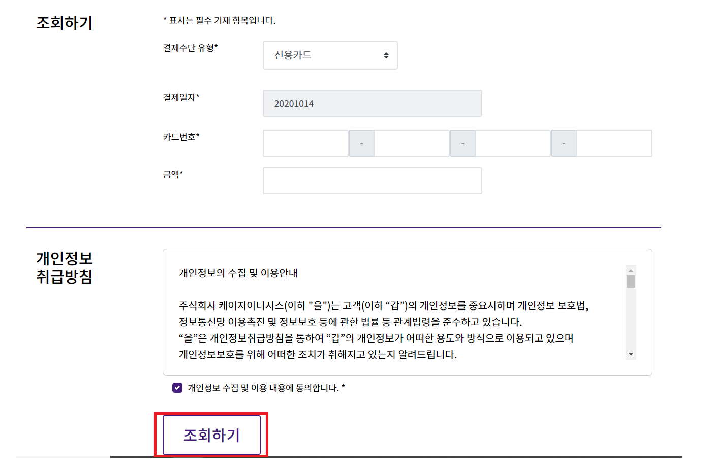 전부 작성 후 개인정보 취급방침에 동의 후 "조회하기" 버튼을 클릭합니다.