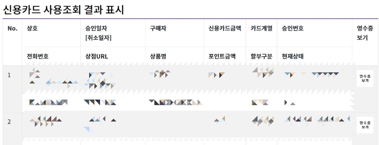 상호명과 승인일자, 상품명, 금액 등 조회 가능합니다.